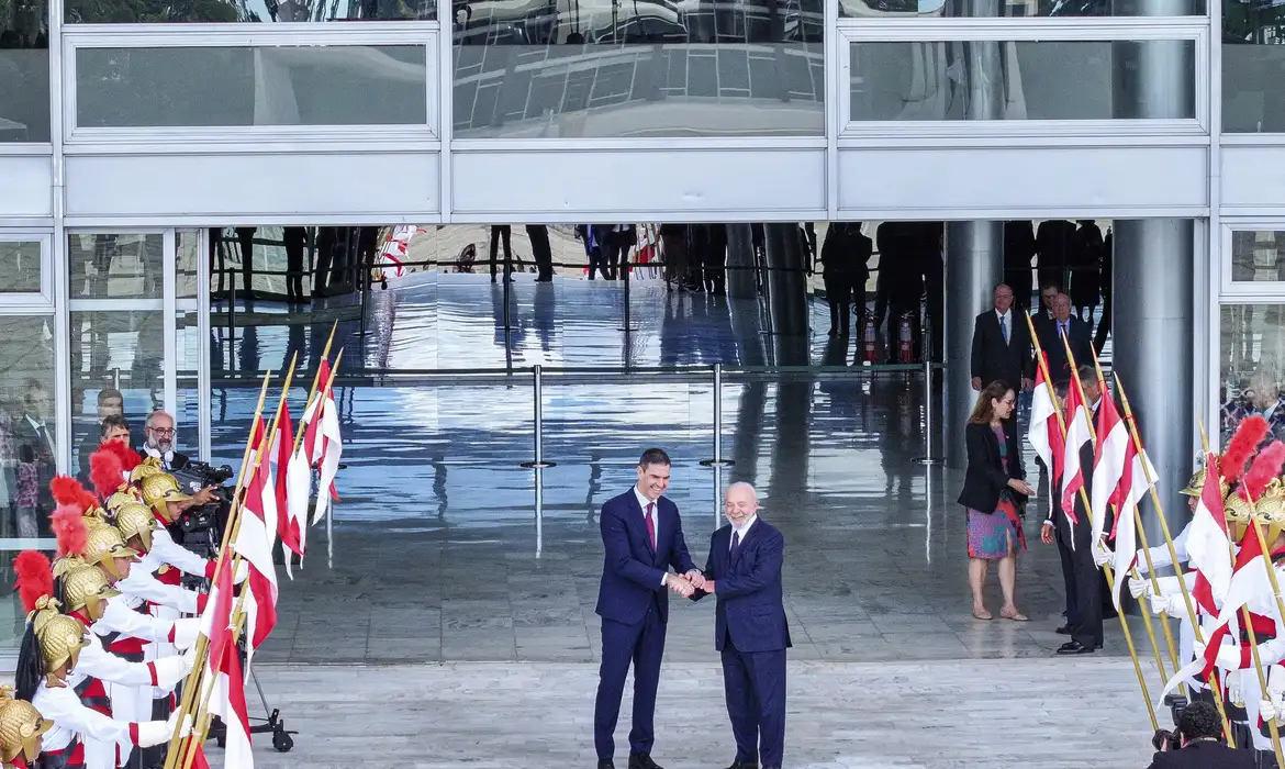 O presidente Luiz Inácio Lula da Silva recebeu, nesta quarta-feira (6), no Palácio do Planalto, o presidente da Espanha, Pedro Sánchez, que está em visita oficial ao Brasil. Durante o encontro, foram assinados acordos bilaterais nas áreas de comunicações; ciência, tecnologia e inovação; administração pública e saúde. Lula e Sánchez manifestaram intenção de ampliar as relações políticas, comerciais e de investimentos.