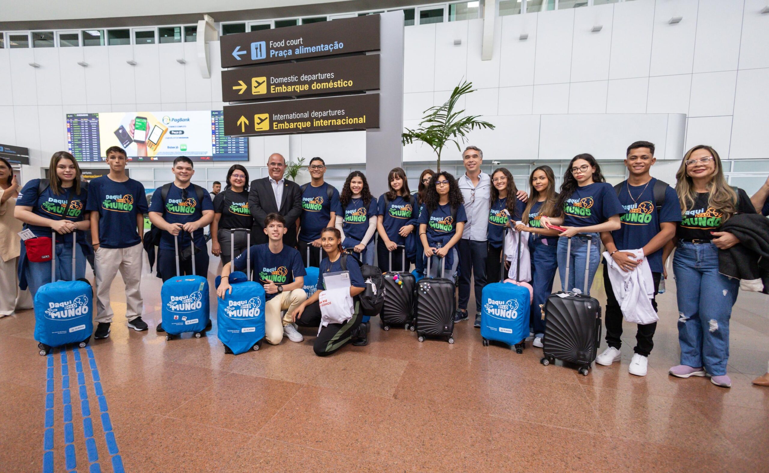 O governador interino, Fernando Tourinho, esteve nesta quinta-feira (16) no Aeroporto Internacional Zumbi dos Palmares, junto com a secretária de Estado da Educação, Roseane Vasconcelos, e o deputado federal Rafael Brito, para acompanhar o embarque de 50 estudantes da rede pública que estão de partida para Londres. Eles participarão de um intercâmbio cultural através do programa estadual “Daqui pra o mundo”.