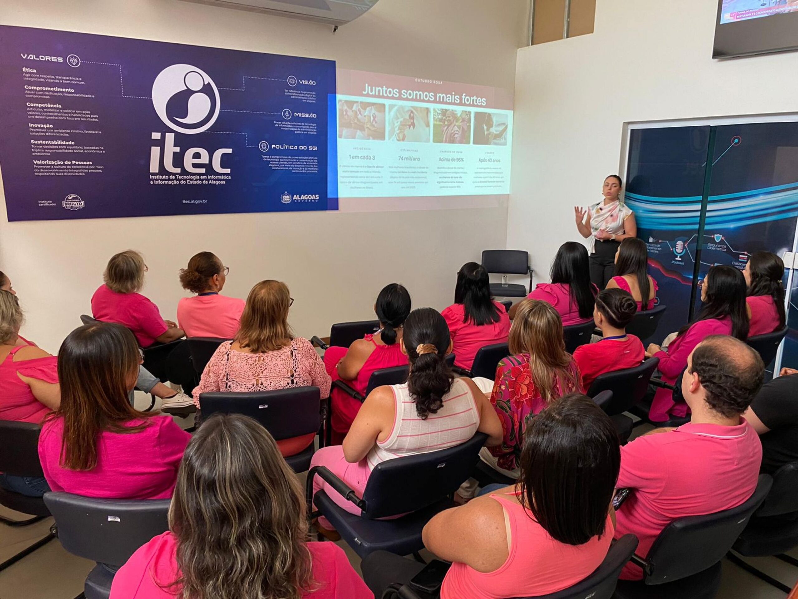 O Instituto de Tecnologia em Informática e Informação do Estado de Alagoas (ITEC) recebeu, na manhã desta sexta-feira, 18, a mastologista Carla Araújo para uma palestra especial sobre a prevenção ao câncer de mama, como parte da programação do Outubro Rosa. O evento, promovido pela Gerência Executiva de Valorização de Pessoas (GEVP), reuniu mulheres e homens em um ambiente acolhedor, e reforçou a importância da conscientização sobre o diagnóstico precoce e os cuidados com a saúde.