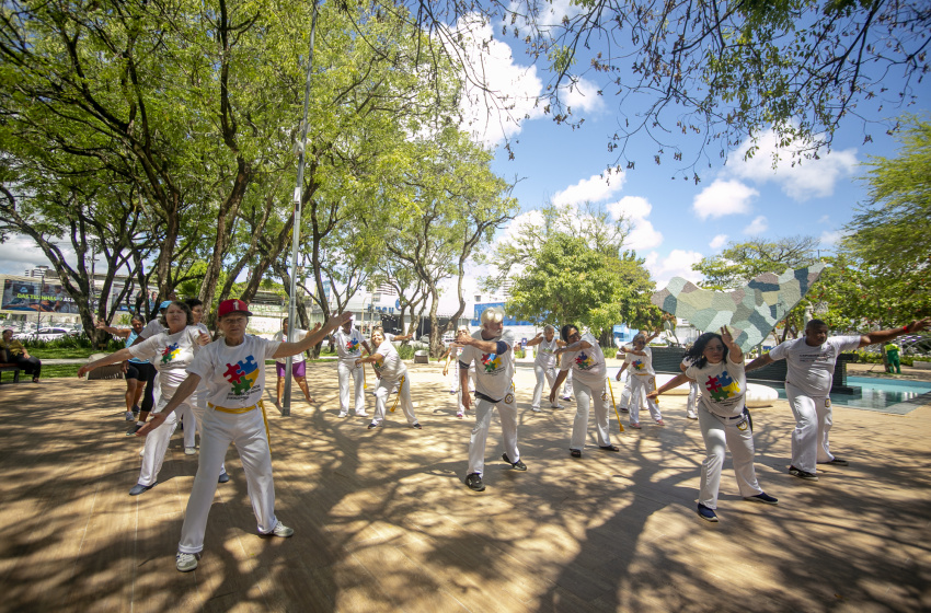 Na manhã desta sexta-feira (14), idosos do Serviço de Convivência e Fortalecimento de Vínculos do Centro de Referência de Assistência Social (Cras) Pitanguinha, localizado no bairro Farol, realizaram atividades físicas no Parque Centenário. Os participantes desenvolveram a atividade “Na trilha da Ancestralidade”, um aulão e roda de Capoeira e Maculelê, voltada para pessoas 60+.