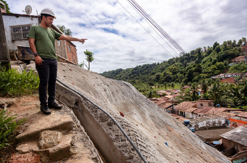 O vice-prefeito e titular da Secretaria Municipal de Infraestrutura (Seminfra), Rodrigo Cunha, visitou, nesta terça-feira (27), as obras de contenção, estabilização e drenagem da encosta da Rua Marquês de Abrantes, na Chã de Bebedouro, na parte alta da capital.