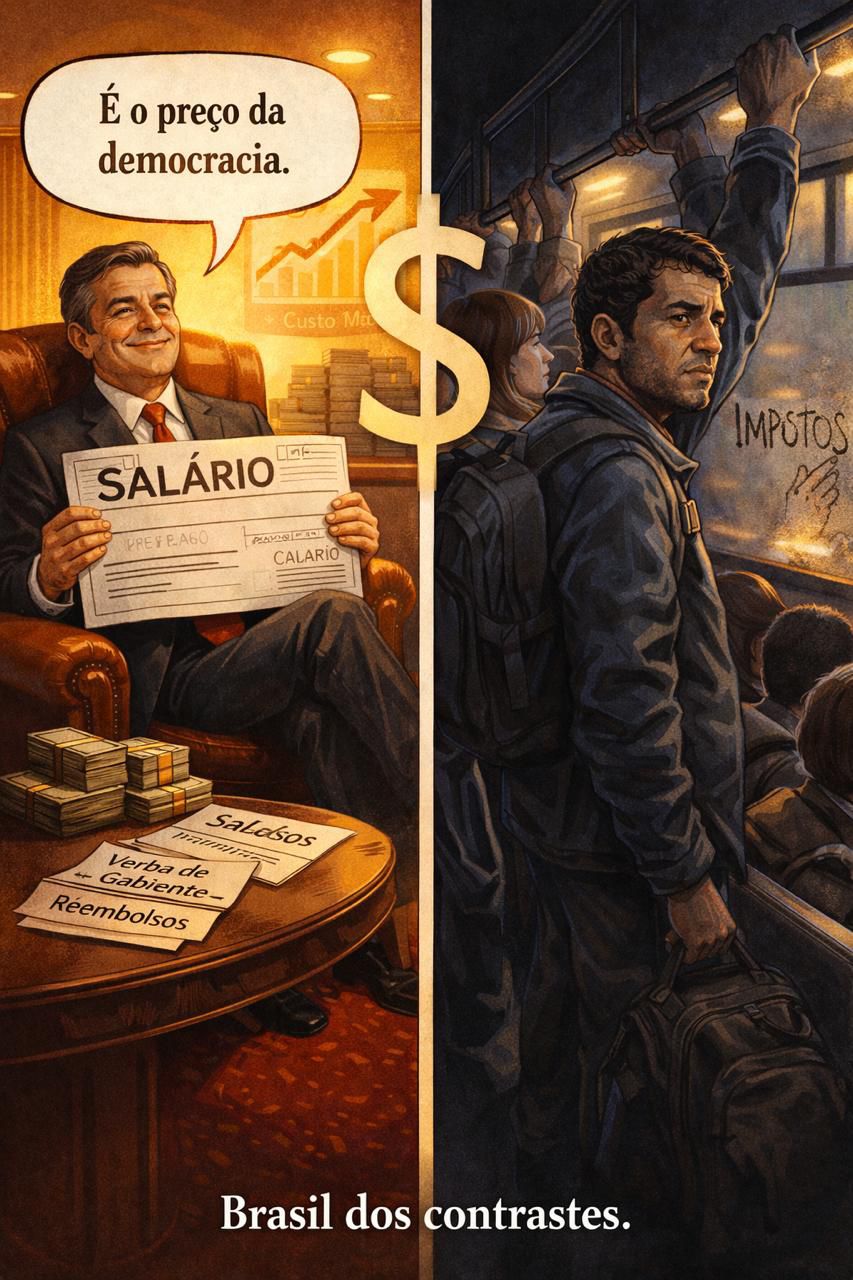 No Brasil, cada parlamentar dispõe de salário superior ao de congressistas da maioria dos países desenvolvidos, além de verbas de gabinete que superam o orçamento de pequenas prefeituras. Um deputado federal brasileiro custa ao contribuinte, por mês, o equivalente a cinco parlamentares franceses ou três alemães. Um escárnio financiado com o suor de quem pega ônibus lotado às 5h da manhã para trabalhar.